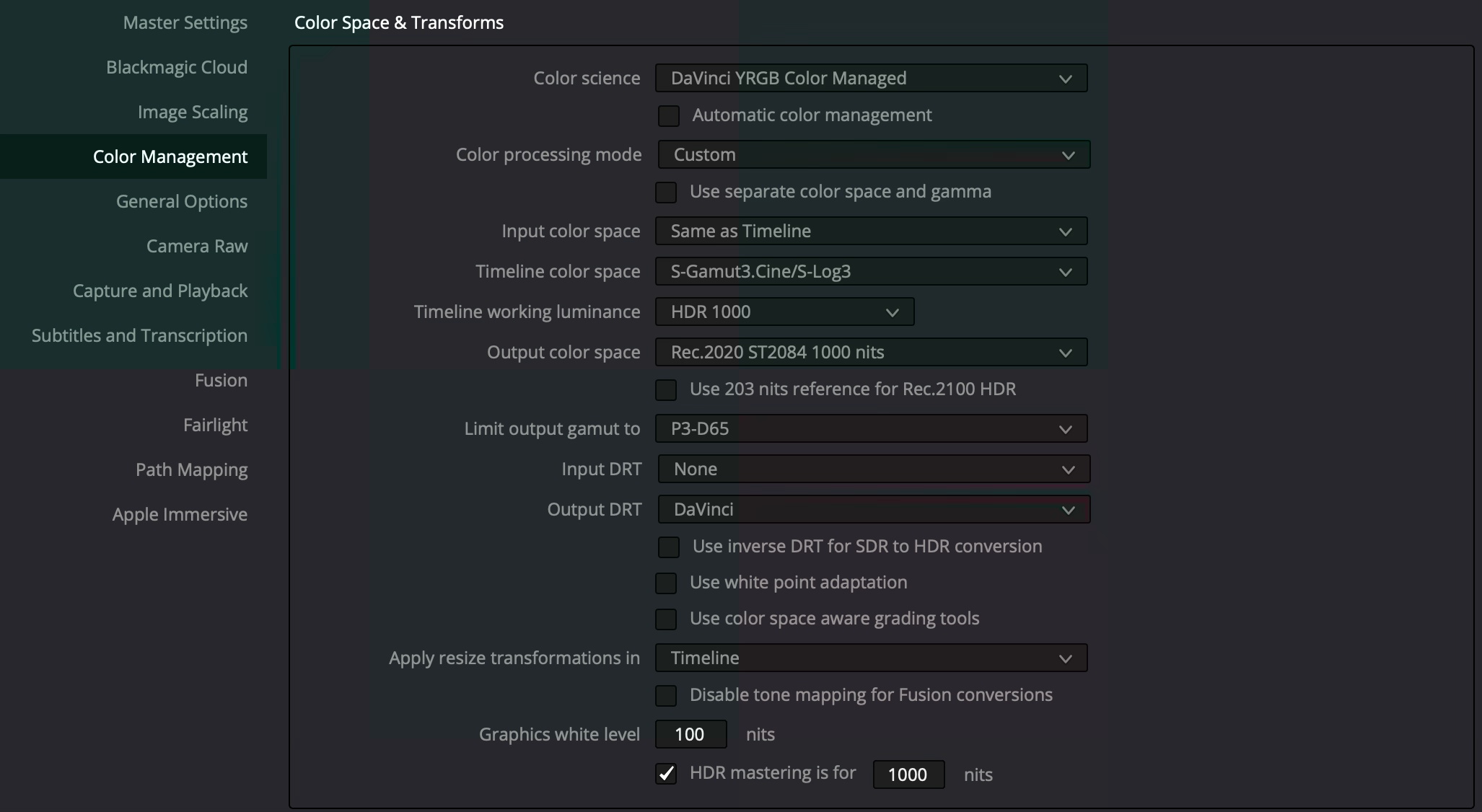 1. Good questions! Yes, use full levels with HDR. Input color space does not determine the output color space: footage from several cameras may be mixed and matched on the timeline, it does not alter the output color space. The input color space of the clips you’re referring to could just as well be changed to Rec.2020 ST2084 1000 nits without affecting anything. The HDR Rec.2020 PQ preset sets up a Rec. 2020 HDR grading environment suitable for wide gamut SDR or HDR deliverables up to 1000 nits. I might change the recommendation to HDR DaVinci Wide Gamut Intermediate as it may offer advantages when working with footage from several different cameras and it facilitates grading HDR at high nit levels in the event you’d like to repurpose your material at a later date – and there are few downsides (for instance, having to hand footage off to someone who doesn’t happen to work in DaVinci Wide Gamut).