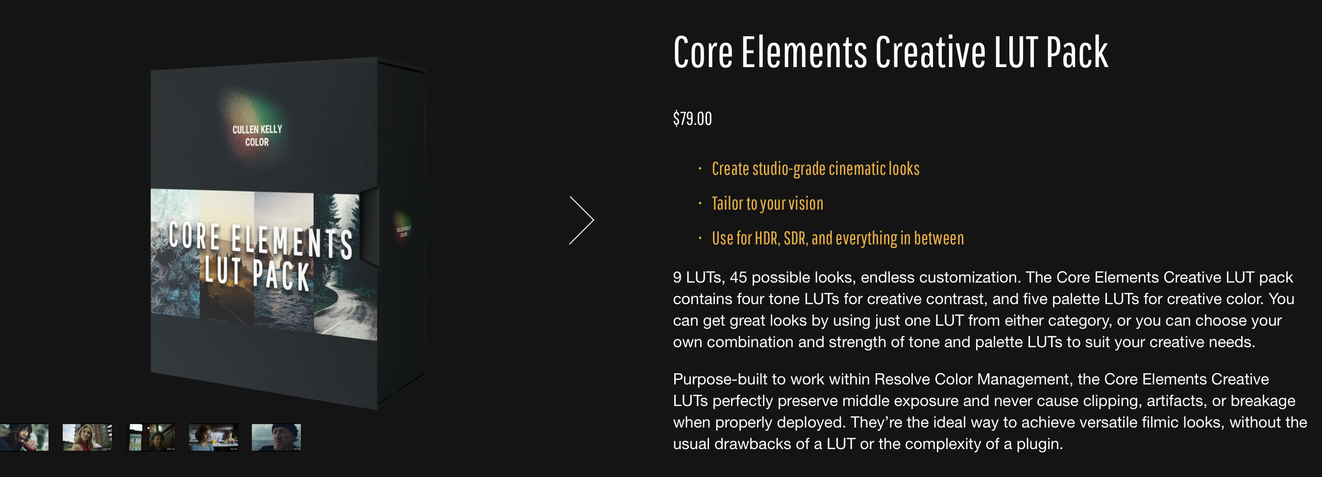 9 LUTs, 45 possible looks, endless customization. The Core Elements Creative LUT pack contains four tone LUTs for creative contrast, and five palette LUTs for creative color. You can get great looks by using just one LUT from either category, or you can choose your own combination and strength of tone and palette LUTs to suit your creative needs. The Core Elements Creative LUT pack sells for just $79.00.