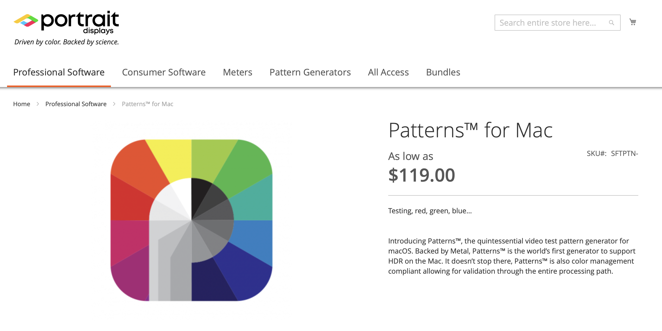 Patterns™ is designed to test the system, not just the display. The app is designed to work in the color spaces you work in. While other solutions may test a single path, Patterns™ is designed to test many; after all, your web browser may be in sRGB but that movie you’re color grading could be in P3-D65, ST 2084, so why would you only calibrate or test sRGB?
