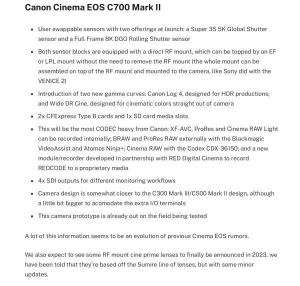 This rumor is too wild! A Canon EOS C700 Mark II with user swappable sensor (s35 5K global shutter/FF 8K DGO rolling shutter), a new gamma curve designed expressly for HDR (!), the ability to shoot XF-AVC, ProRes and Cinema RAW Light internally, BRAW and ProRes RAW with the Blackmagic Video Assist and Atomos Ninja... Continue Reading →