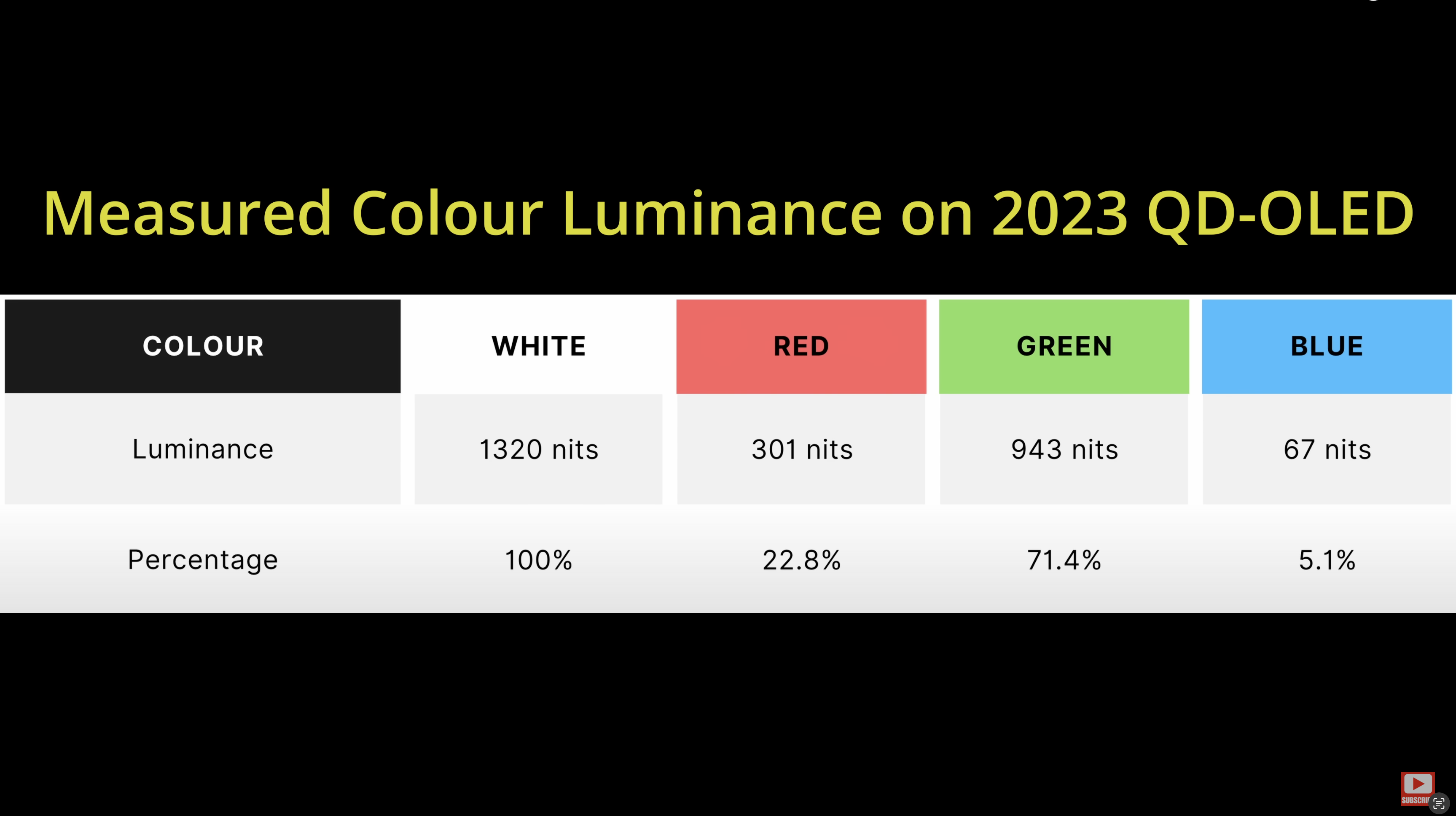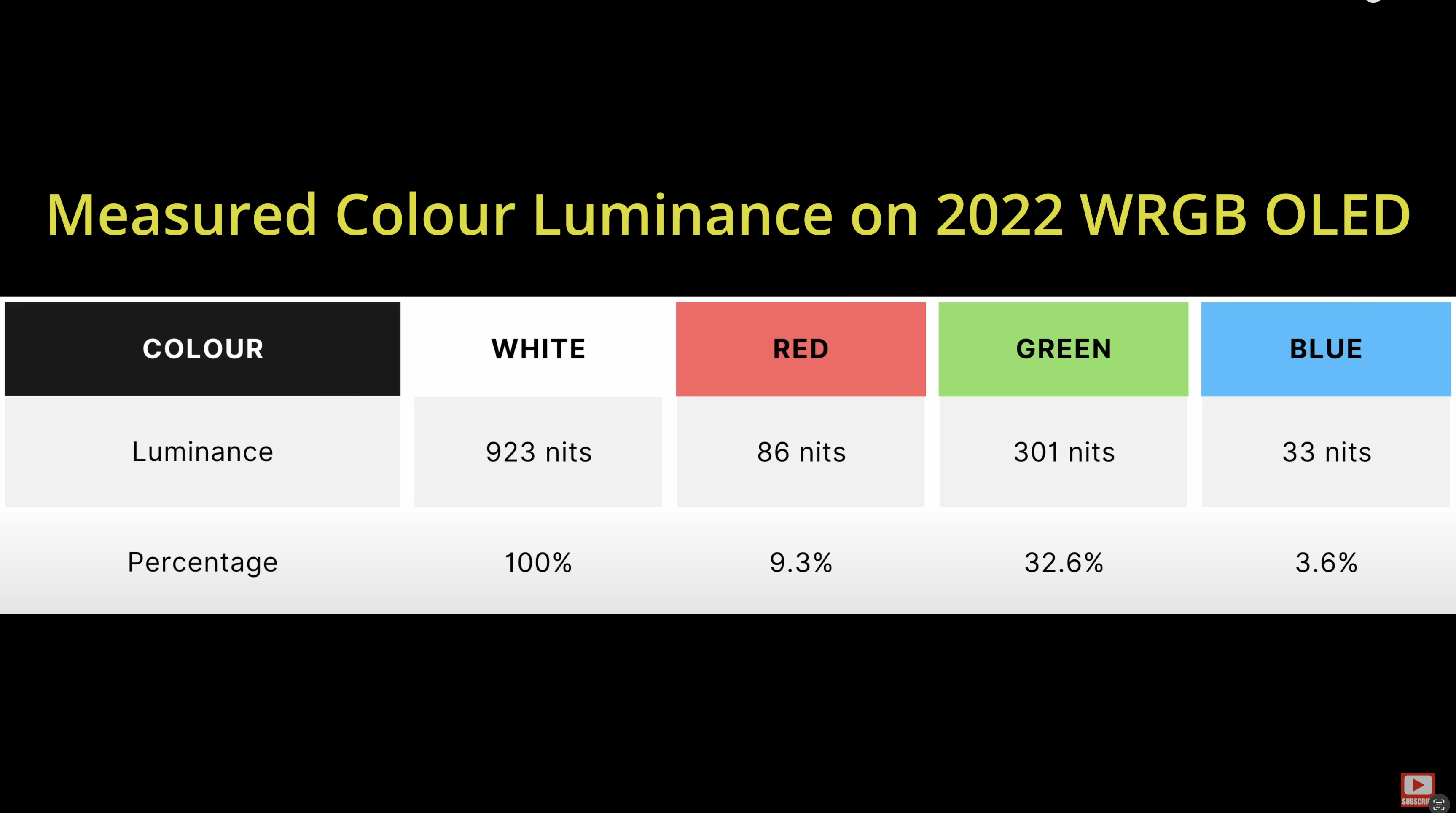 “On QD-OLEDs, the peak brightness is the sum total of the red, green and blue outputs…. By contrast, […] WRGB OLEDs use white subpixel boosting to achieve higher brightness, so if we do the same measurements of red luminance, green luminance and blue luminance on a WRGB OLED television, you will see that they only make up a fraction of the white luminance because the biggest contribution actually comes from the white pixel.”