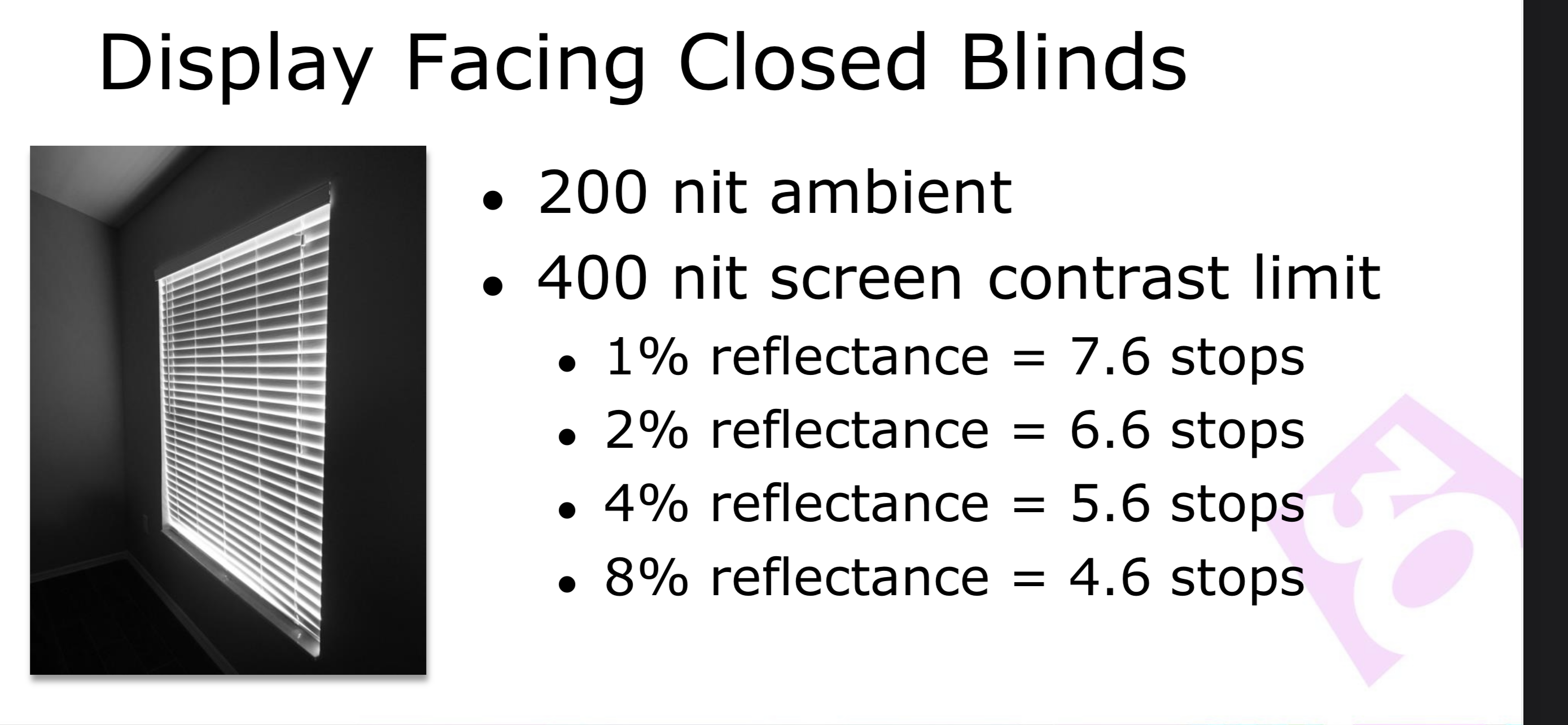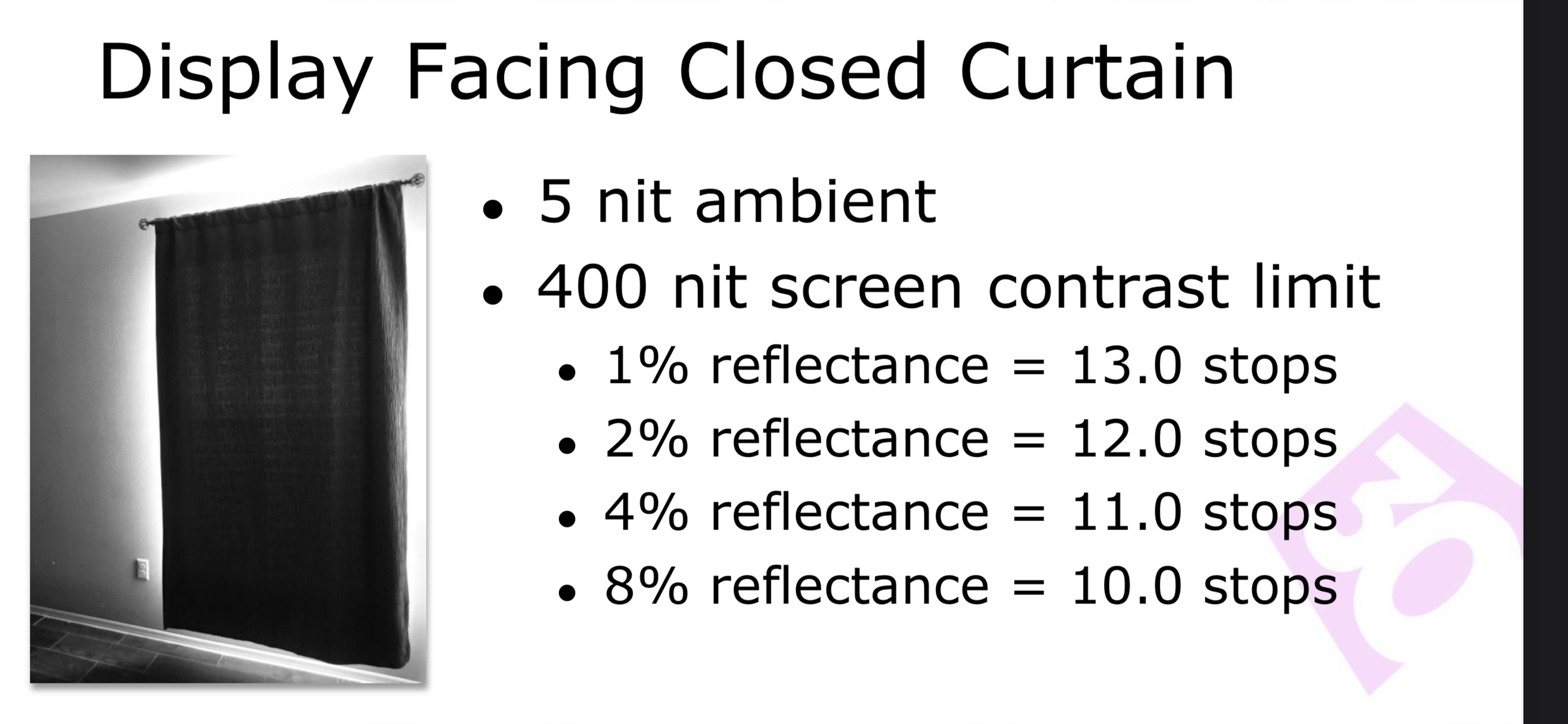 There’s no denying that movies look a heck of a lot more cinematic on a TV as opposed to viewing on a tiny 16” laptop, but we were rudely reminded of why the experience was always less than satisfactory: the entire room lights up like a Christmas tree when watching content on a 55” display, degrading image contrast and destroying the sense of immersiveness. ‘Perfect blacks’ are the selling point of OLED televisions, somewhere in the neighborhood of 2/3 of the dynamic range of OLEDs is situated below middle gray, yet ambient light just annihilates that advantage. It’s well known that the viewing environment plays a larger role in the ability to display HDR than the range of display capabilities. The actual black level is the sum of light contribution from the display’s native black and screen reflections. The screen grabs, from a presentation by Timothy Lottes (AMD) at a Game Developers Conference back in 2016, convincingly illustrate the relationship between ambient light and display contrast. Decreasing screen reflectance by fifty percent doubles the effective contrast ratio in ambient light. The figures are for an OLED TV with a peak luminance of 400 nits and are only intended to give an idea of general ranges, not specific values. Current OLED TVs have a screen reflectance of around 1-2%.