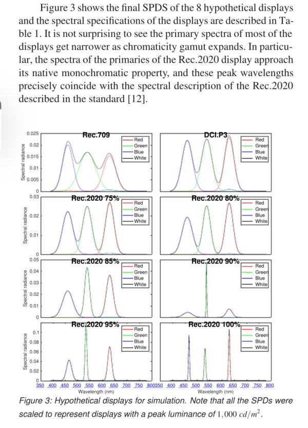 The smallest observer metamerism magnitude (OMM) index was found to be between Rec.709 and DCI-P3, the two display color spaces with the broadest spectra. OMM indices induced by the display Rec.2020 100% are nearly twice as large as those of display Rec.2020 90%. Effect of color gamut and luminance on observer metamerism in HDR displays,... Continue Reading →