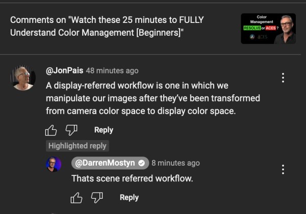https://youtu.be/AAeZKZ5feGA?si=awlpC8y0CmhCK-RP Shortly after colorist Darren Mostyn published his latest color management video, we pointed out that his explanation of scene-referred and display-referred grading was inaccurate. Not only did he double down on his blunder in his reply, but he’s since deleted our comment and pinned a long, muddled statement in the comments section which will... Continue Reading →