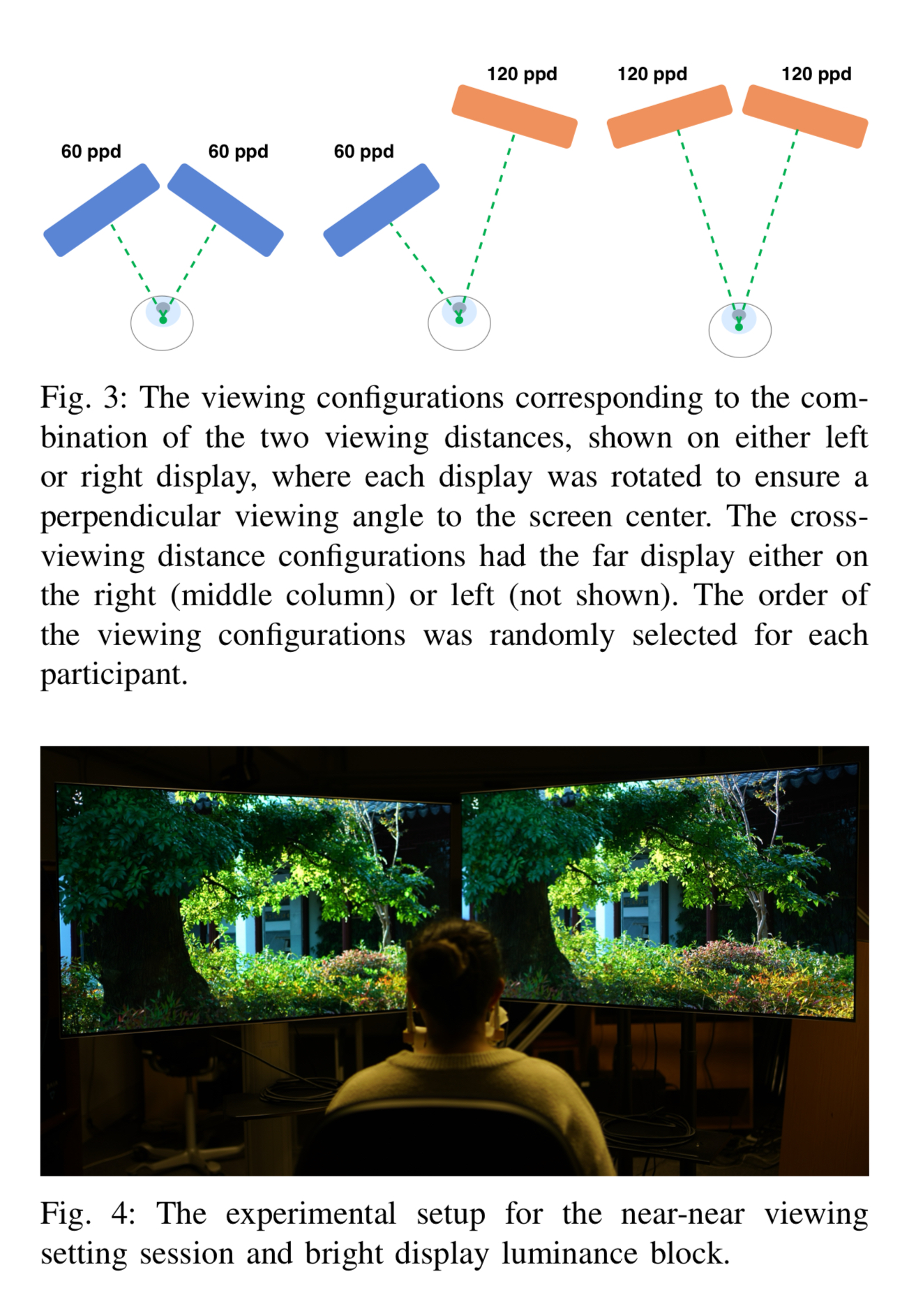 Following the BT.2100-2 recommendations for HDR viewing, two viewing distances were considered in the experiment: 1.6 and 3.2 of display height (an effective resolution of approximately 60 ppd and 120 ppd), as well as two display luminance levels: a bright display (peak luminance of 700 cd/m² and a mean luminance of 51 cd/m² as measured from a color patch covering 5% of the display using the Konica Minolta Chroma Meter CS-200) and a dim display (peak luminance of 600 cd/m² and a mean luminance of 5.6 cd/m²). The dimmer simulated using an OpenGL fragment shader that reduced the luminance of all pixels by a factor of 8 (in a linear RGB color space). The experiment was conducted in a controlled environment within a dim room, maintaining an ambient illumination of approximately 0 lux throughout the experiment.