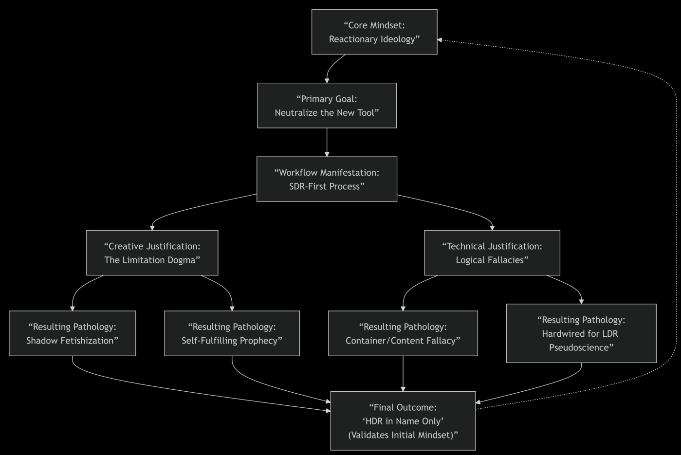 The flowchart above maps the self-reinforcing system of reactionary HDR pathologies. The following sections define and dismantle each weapon in this arsenal.