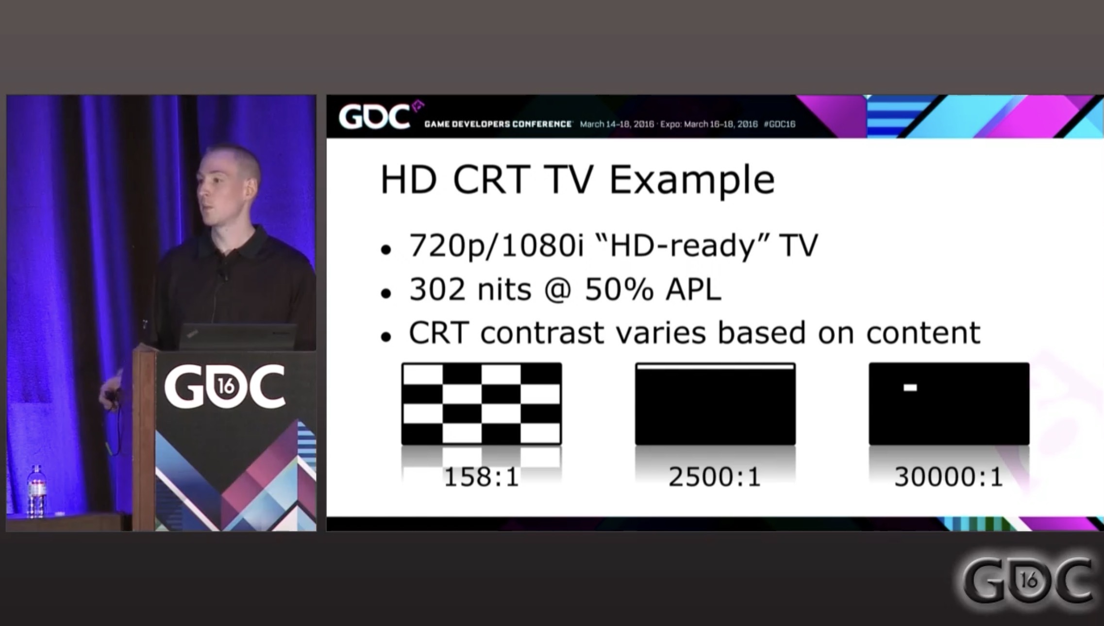 Timothy Lottes, “Advanced Graphics Techniques Tutorial Day: Advanced Techniques and Optimization of HDR Color Pipelines,” GDC Vault (2016) Presentation slide shows an “HD-ready” CRT TV measured at 302 nits peak. It lists a 158:1 ANSI contrast from a standard checkerboard test, but then presents contrast ratios of 2,500:1 and 30,000:1 from non-standard test patterns (a thin strip and a tiny white rectangle). This demonstrates the selective use of unrealistic, low-APL measurements to exaggerate display capability.