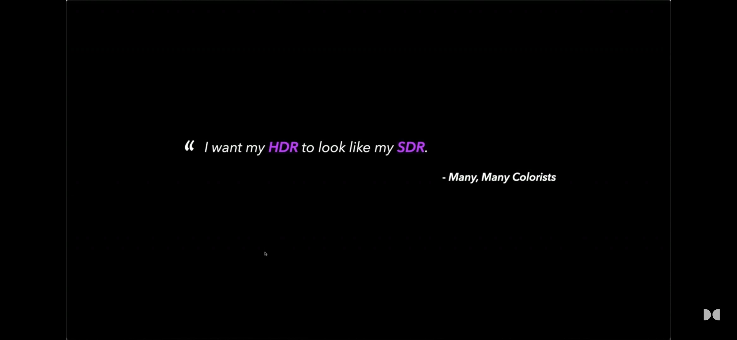 For Siragusano, the desire for invertibility is symptomatic of a failure to engage with the process. If you can grade in SDR and “invert” to HDR, you never have to learn HDR’s grammar. You never have to make creative decisions for HDR. This attitude is exemplified by Joshua Pines, who frames the “problem” as HDR and SDR looking different. His solution: make them the same: